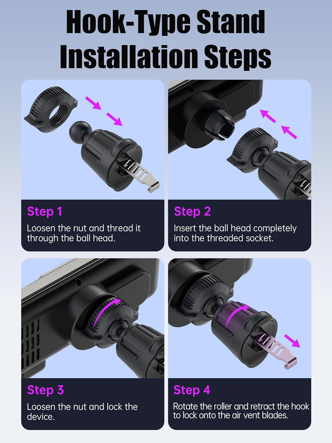【Étapes d’installation détaillées】1. Passez l’écrou à travers le support. 2. Insérez le support dans le produit. 3. Serrez l’écrou. 4. Réglez l’angle pour la charge sans fil.