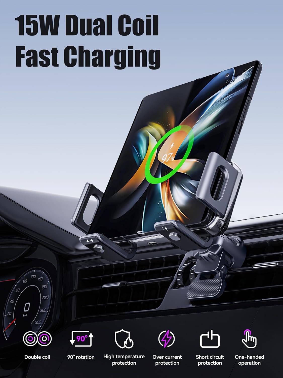 Le Prix Support de téléphone pour voiture à double bobine, chargeur sans fil voiture QI 15W, compatible avec Samsung Galaxy Z Fold/Flip 6/5/4/3, Support de capteur de téléphone portable pour Google 9 Pro Fold au Maroc