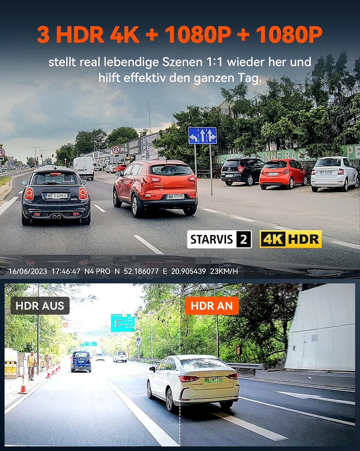 【4K HDR + 1080P HDR+ 1080P HDR / STARVIS 2】 Grâce à la nouvelle génération SONY STARVIS 2, la qualité d’image 4K de la dash cam atteint une clarté inégalée, Les 3 caméras de voiture équipés de HDR avant 158° + intérieur 165° + arrière 160°, permettant de régler l’exposition pour ne pas rater des informations routières importantes tels que les plaques d’immatriculation et les urgences. Les images capturées sont synchronisées avec la scène réelle, N4 Pro vous offre la garantie la plus puissante.