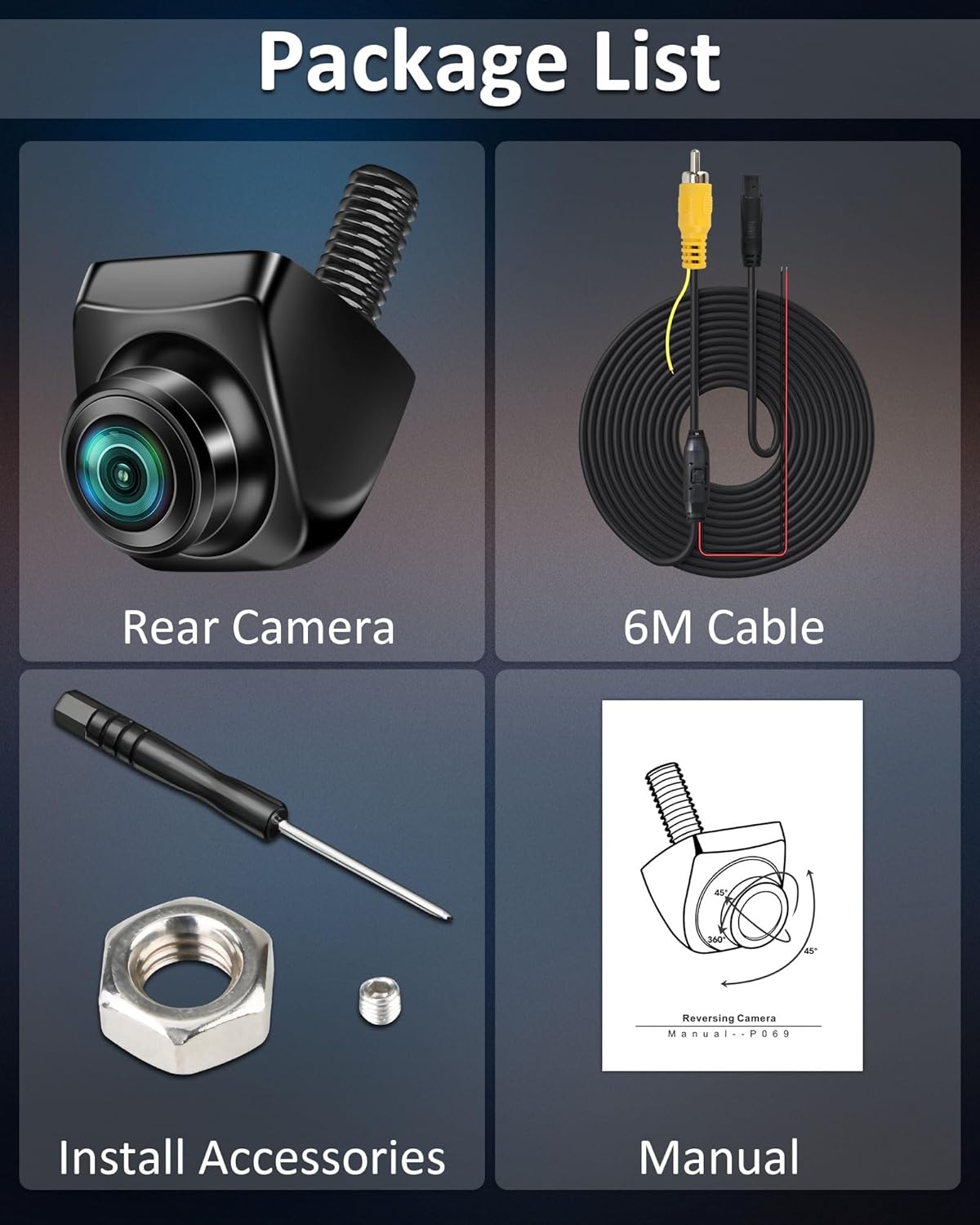 360 Rotatable Rear View Camera The rear view camera can rotate 360° and can be adjusted 45° up/down/left/right, which allows you to install the car rear view camera in any position, vertical (inverted) or horizontal. If the image of the rear view camera is too high, too low or upside down due to the installation angle, you can directly rotate the rear view camera to adjust it 45° up/down to get the desired display.